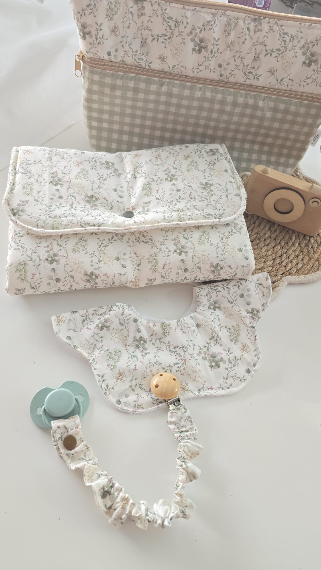 Puedes encontrar el cambiador y el baberito con chupetero a juego en productos relacionados.