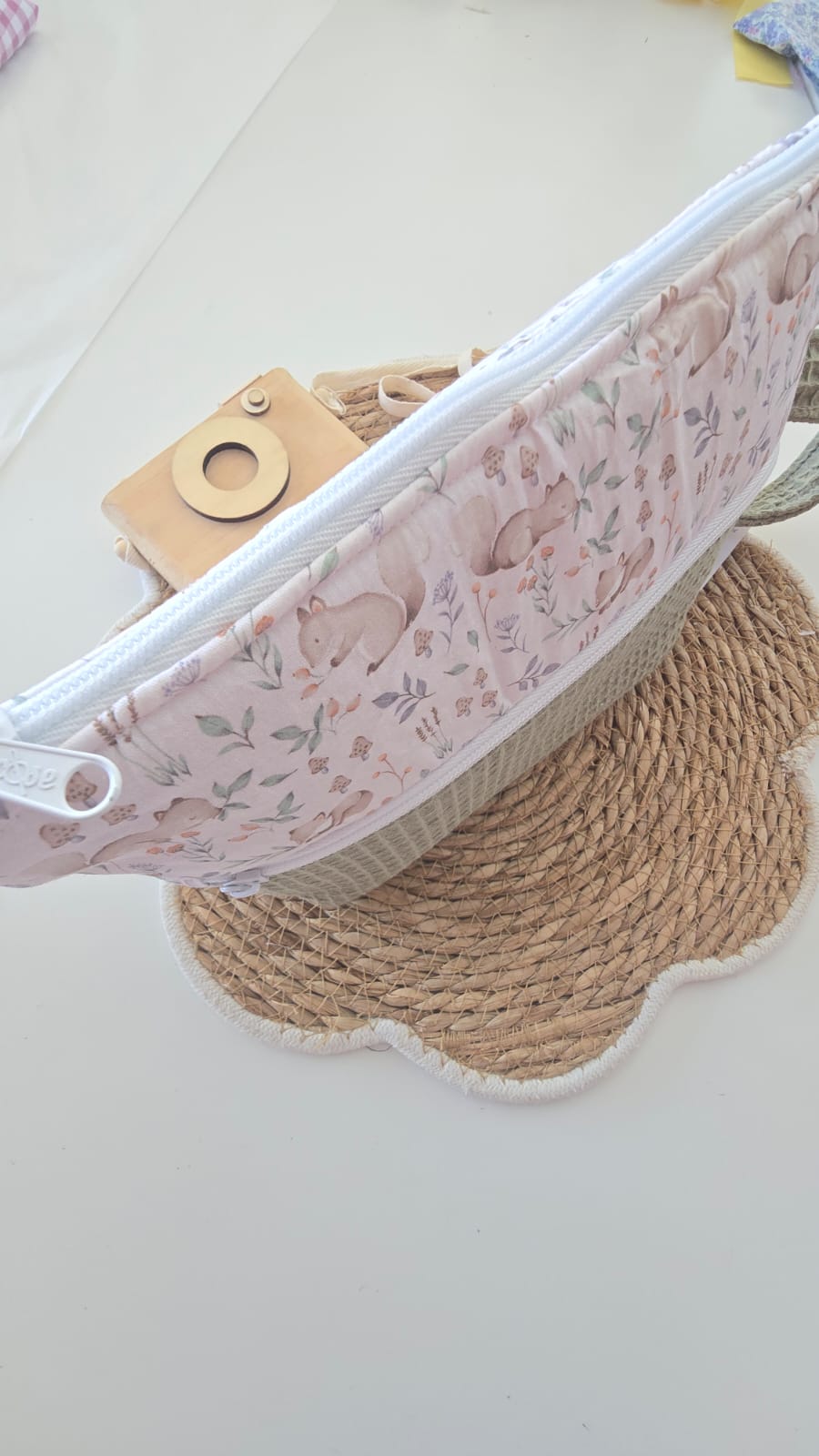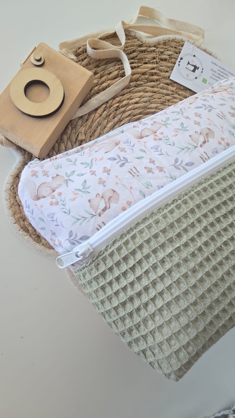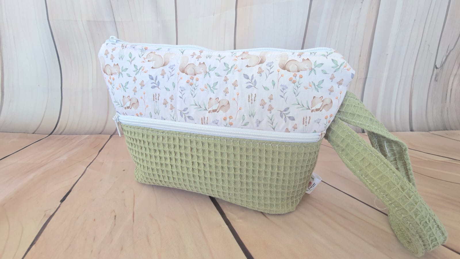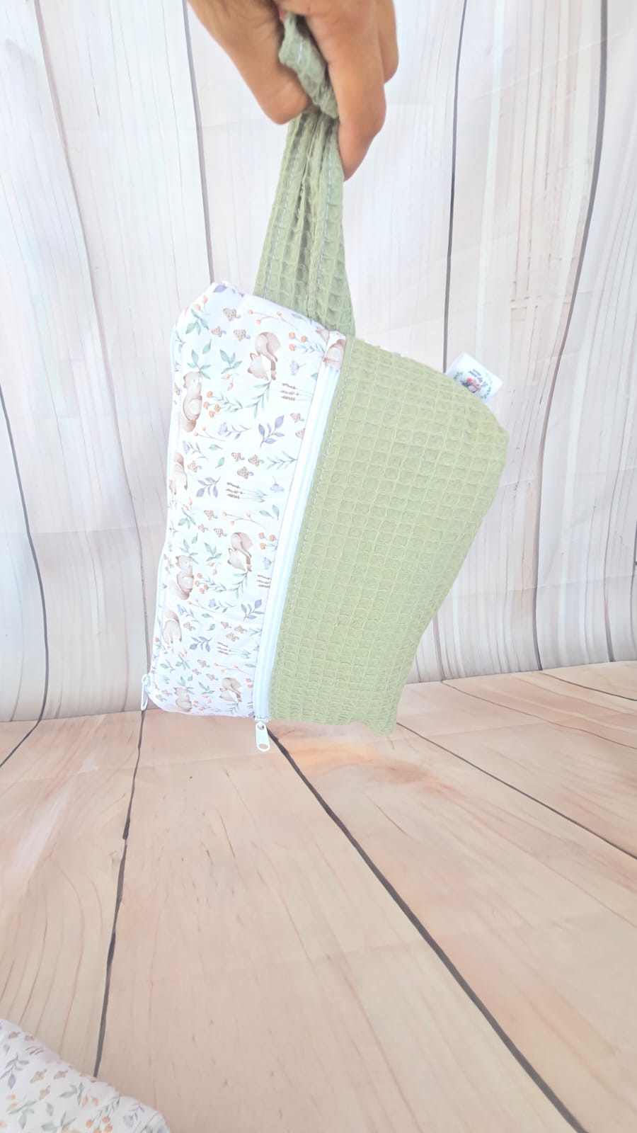 Práctico neceser para guardar los pañales, toallitas y cremas de tu bebé. Lleva un bolsillo en el exterior con cremallera.